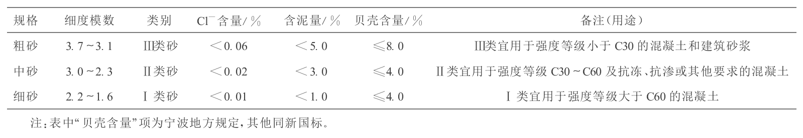 新国标《建筑用砂》(GB/T14686-2001)对原国标贝壳含量作了补充规定并从2002年2月1日开始实施,它对砂的分类与规格作出了新的规定,淡化海砂的控制指标如下图