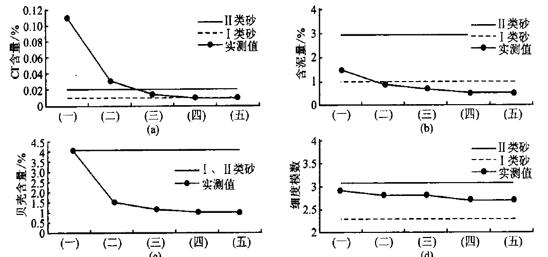经过实地检测(见下图)可知,一道和第二道加工工序非常关键,一道工序经滚筒筛去除粗颗粒,粗贝壳等,(筛孔不大于8mm)加之淡水冲洗氯离子含量降低达70%左右,含泥量降低40%,贝壳含量降低了60%,检测效果非常显著。经过第二道工序后氯离子含量降低15%,含泥量降低了12%,贝壳含量降低10%。海砂淡化综合指标已经全面达到二类砂标准,贝壳含量和含泥量已经达到了一类砂标准。经过第三道轮式洗砂机淘洗滤水后各项指标继续降低,氯离子含量继续下降3%,贝壳含量下降2%,而含泥量又大幅下降10以上。实测值为:氯离子0.01% 含泥量0.6% 贝壳含量1.1%。根据这个指标可以明显得到结论:该生产线生产的淡化海砂作为二类中砂用于C30--C60的混凝土配制是完全没有问题的,除细度模数之外其他指标均达到了一类砂标准。